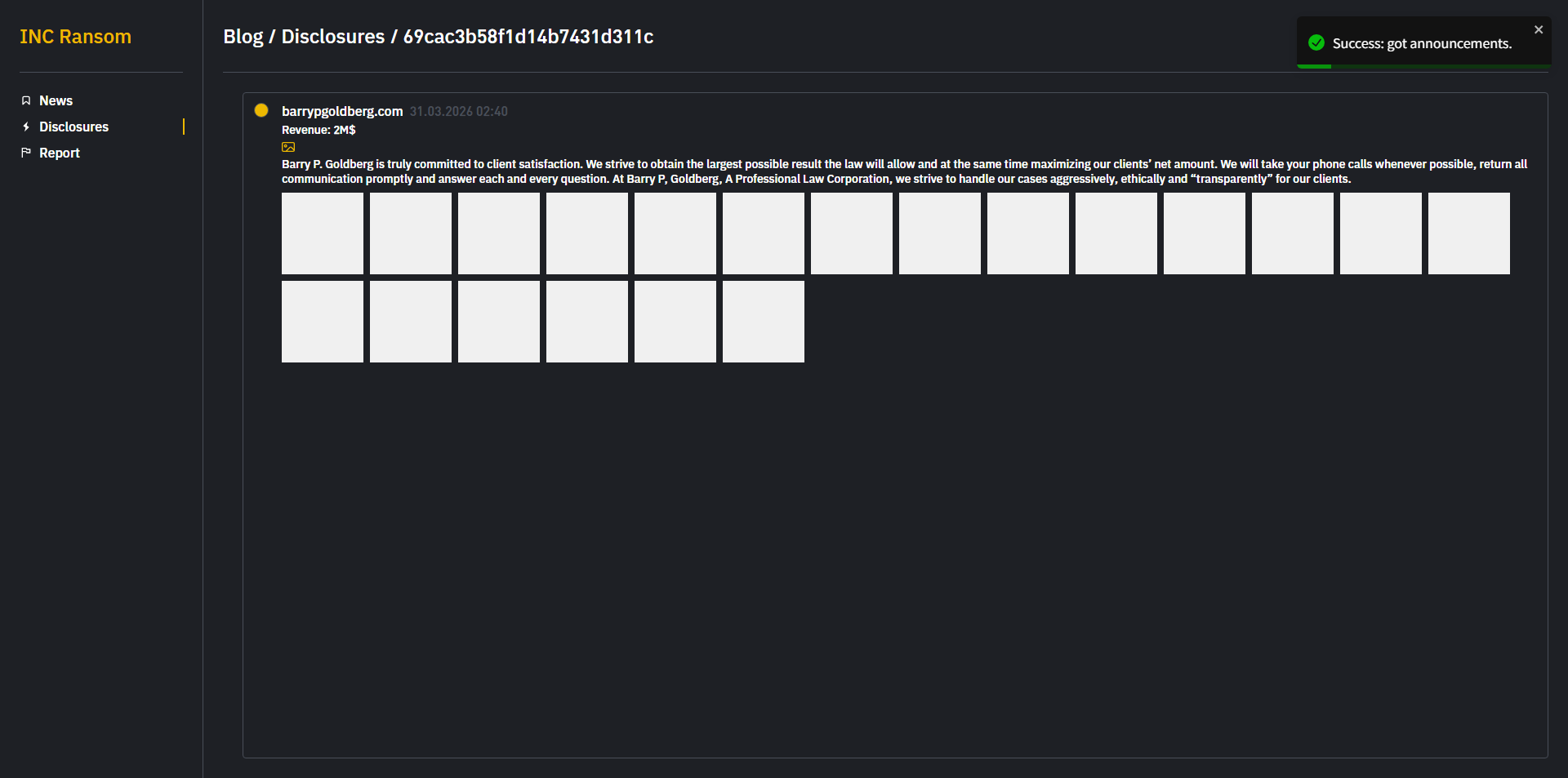 黑客论坛上曝光了美国加州Barry P. Goldberg专业律师事务所(barrypgoldberg.com)的内部数据,包含大量客户案件文件、合同协议、财务记录及敏感法律文档。
