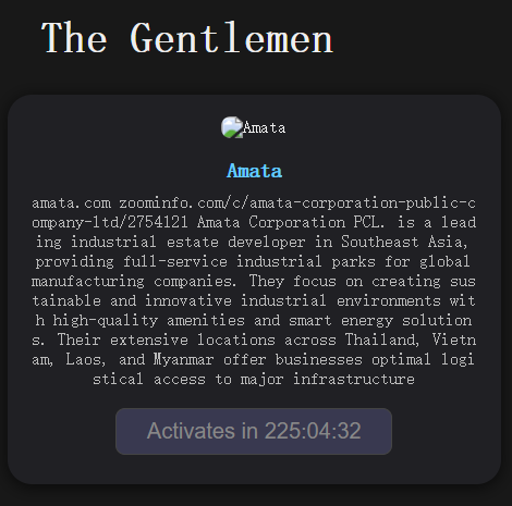 泰国领先的工业地产开发商 Amata Corporation PCL于2026年2月26日在暗网被新兴勒索组织 The Gentlemen 公开列为受害者。该公司成立于1970年代中期,总部位于泰国,是东南亚地区最大的全服务工业园区开发商,管理总面积超过140平方公里的工业园区,服务超过1500家全球制造企业。重点创建可持续、智能能源解决方案和高品质设施,提供物流便利接入主要基础设施,业务覆盖泰国(Chonburi、Rayong等)、越南(Bien Hoa、Long Thanh、Ha Long)、老挝(Natuey、Namor)和缅甸(Yangon)。公司员工约350人,强调“ALL WIN”理念(资源负责使用、循环经济、低碳创新、社区价值)。