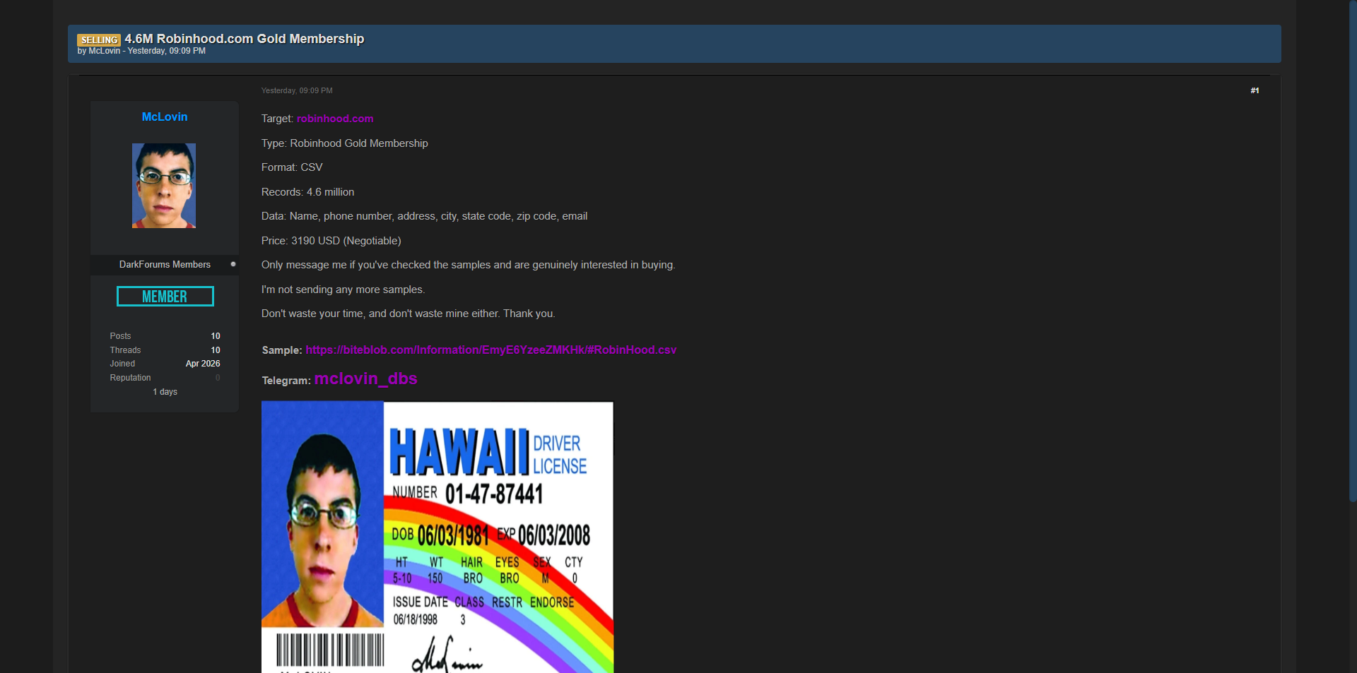 黑客论坛曝光美国Robinhood.com金牌会员460万条完整用户数据,包含姓名、电话号码、详细地址、城市、州代码、邮编及邮箱等个人信息。