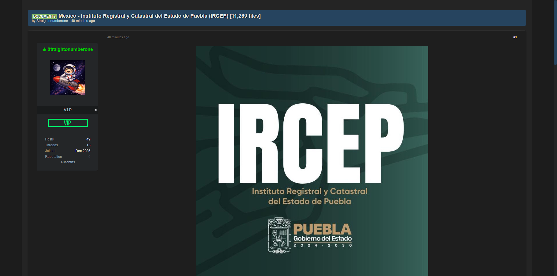 黑客论坛曝光墨西哥普埃布拉州土地登记与地籍局(Instituto Registral y Catastral del Estado de Puebla,IRCEP)完整文件数据库,共11,269份官方文档,泄露了大量土地登记、地籍档案、产权记录等核心政府数据。