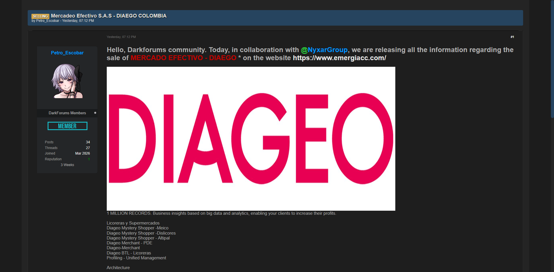 黑客论坛曝光哥伦比亚Mercadeo Efectivo S.A.S(DIAEGO)完整客户数据库,共100万条记录。该公司专注于超市、酒类零售及神秘顾客调研大数据分析服务。