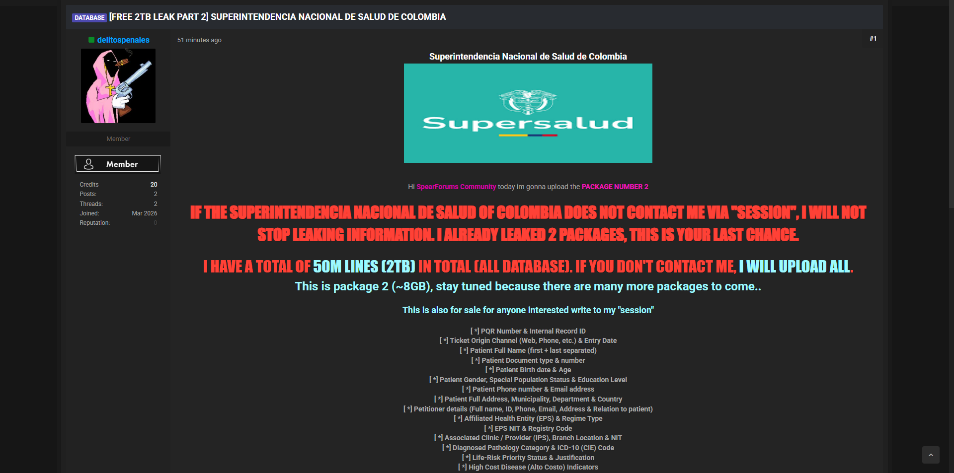 威胁行为者在黑客论坛上曝光了哥伦比亚国家卫生监督局(Superintendencia Nacional de Salud / SuperSalud)的患者医疗数据库。该数据包含大量高度敏感的患者个人信息和医疗记录。
