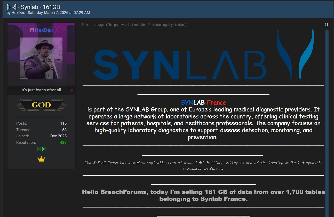 法国领先医疗诊断提供商Synlab France发生大规模数据泄露。该集团是欧洲医疗诊断领域的巨头之一,在法国运营广泛的实验室网络,为患者、医院和医疗专业人士提供临床检测服务,专注于高质量实验室诊断以支持疾病检测、监测和预防。威胁行为者在黑客论坛上公开宣称入侵,并上传161 GB数据,声称来自超过1700张表格的完整导出。