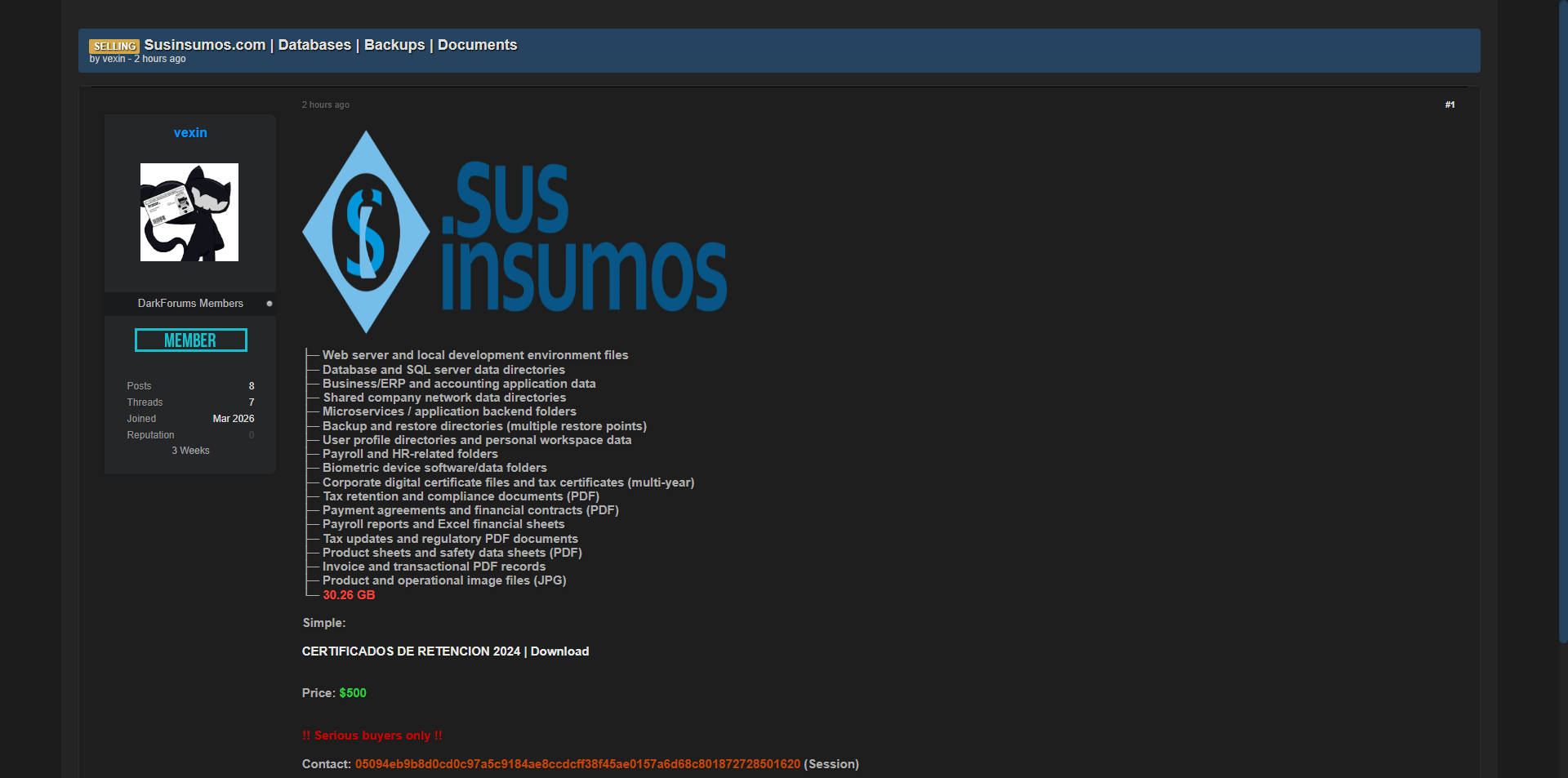 黑客论坛上出售巴西Susinsumos.com公司的全面内部数据,总量30.26GB,包含数据库、ERP会计系统、人事薪资、生物识别数据、税务证书、财务合同、发票记录以及备份文件等核心企业信息。