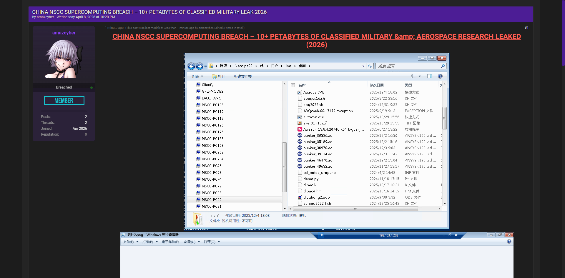 黑客论坛曝光中国某军事航天行业*超级计算中心大规模数据泄露,包含10+PB机密军事与航空航天研究数据,泄露文件涉及超级计算节点、GPU集群、模拟软件及大量科研项目文件。