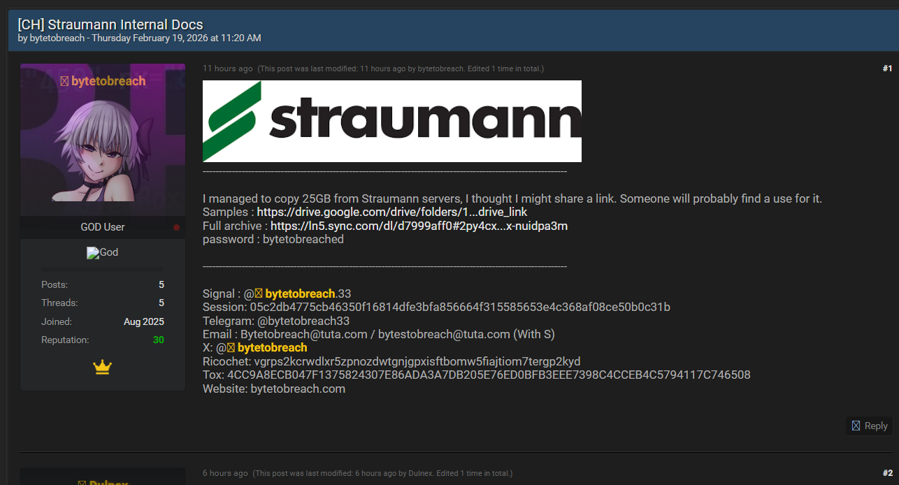 瑞士牙科种植与口腔护理企业 Straumann(士卓曼) 发生重大数据泄露事件。威胁行为者宣称已入侵其内部系统,非法窃取并复制了总计 25GB 的内部核心文档。