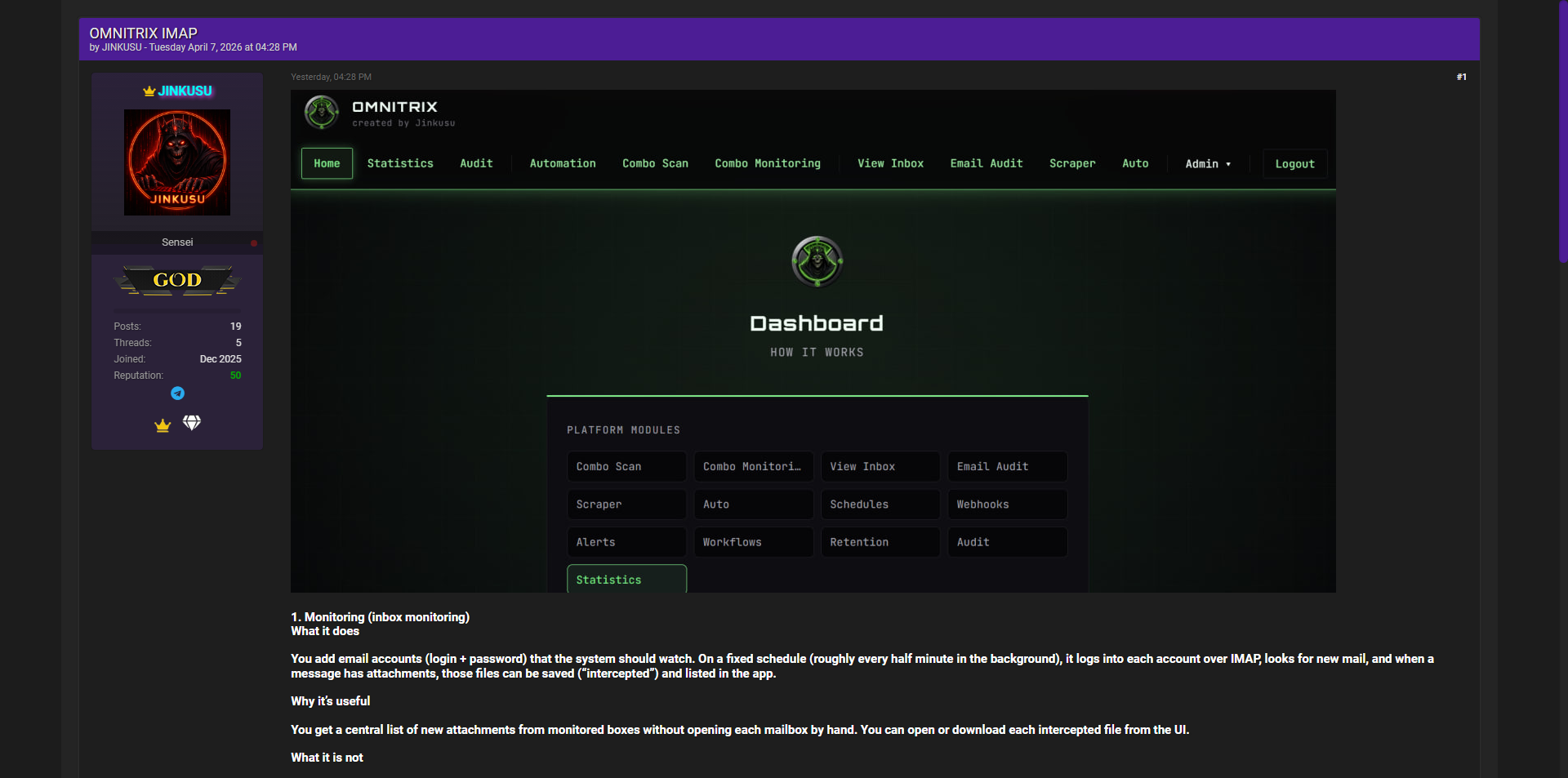 黑客论坛发布Omnitrix IMAP高级监控工具,该工具可自动添加邮箱账号登录凭证,每半分钟通过IMAP协议扫描新邮件并拦截附件,全部保存至中央仪表盘。