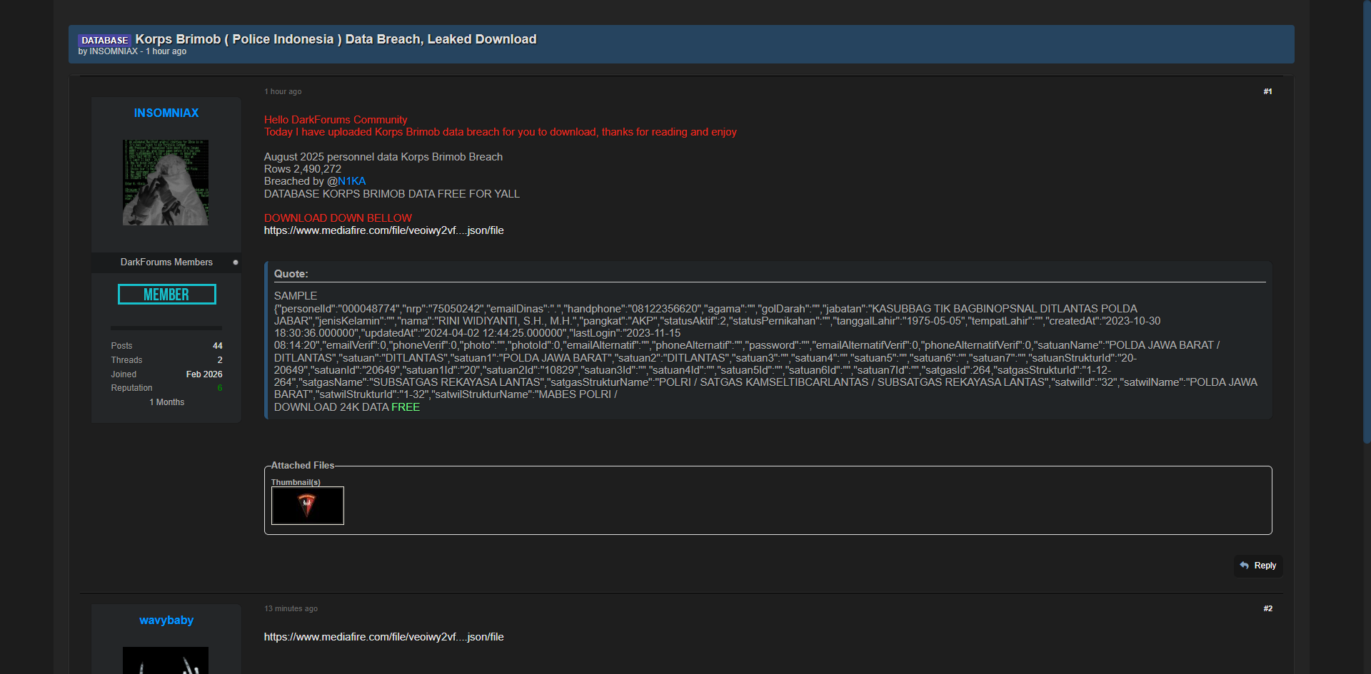 黑客论坛免费发布印度尼西亚国家警察机动部队(KORPS BRIMOB)2025年8月完整人员数据库,共249万条记录,包含大量现役警员姓名、警号、公务邮箱、手机号码、职务、出生日期、宗教信仰、血型、所属单位等敏感信息。