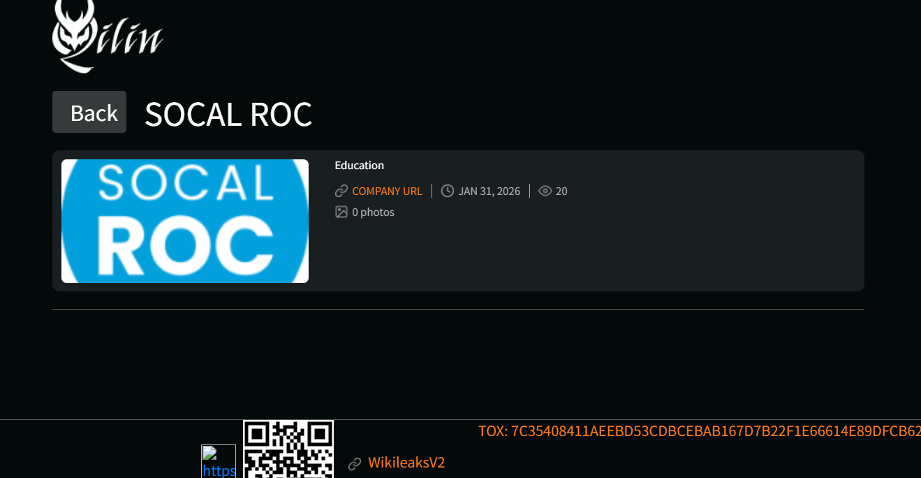 这份勒索软件声明指向美国南加州区域职业教育中心(SoCal ROC)为攻击目标,据称此次事件系威胁行为者麒麟(Qilin)团伙所为。
