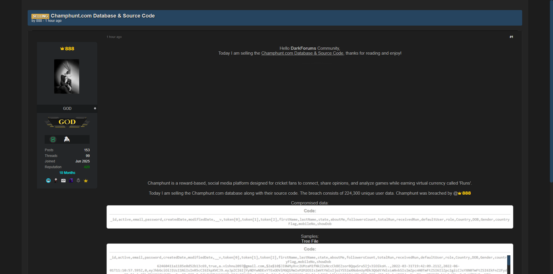 黑客论坛曝光Champhunt.com完整数据库及源代码,该平台是面向板球爱好者的奖励制社交媒体平台。泄露共包含22.4万条独特用户数据,同时包含平台完整源代码。