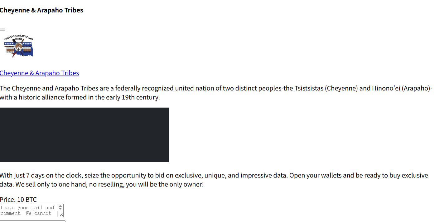 夏延和阿拉帕霍部落(Cheyenne and Arapaho Tribes)被宣称是RHYSIDA勒索软件组织的受害者。该勒索软件组织已向部落索要赎金,赎金金额为10枚比特币(BTC),按发布时汇率计算,折合美元约677,365.30美元,目前暂未明确部落是否已回应赎金要求。