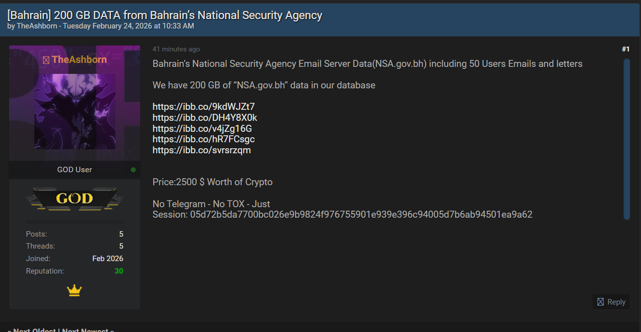 2026年2月24日,巴林国家安全局(National Security Agency)的邮件服务器数据被公开兜售,总量达200GB。泄露者声称数据包含50个用户邮箱账户及其全部邮件内容,已在暗网数据库中持有完整副本。销售帖子附带多个文件托管链接,标价2500美元等值加密货币,仅接受特定会话支付方式。NSA是巴林负责国家安全、情报收集、反恐与国内监控的核心机构,此次泄露涉及高度敏感的政府通信,可能暴露国家机密、情报共享、内部协调及个人隐私。