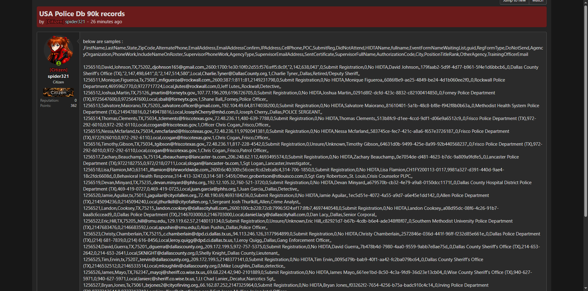 黑客论坛曝光美国警方数据库,共9万条记录,主要来自德克萨斯州多个警察局及执法机构,包含大量在职警员的姓名、地址、邮编、手机号码、备用电话、邮箱、职务、所属部门等敏感个人信息。