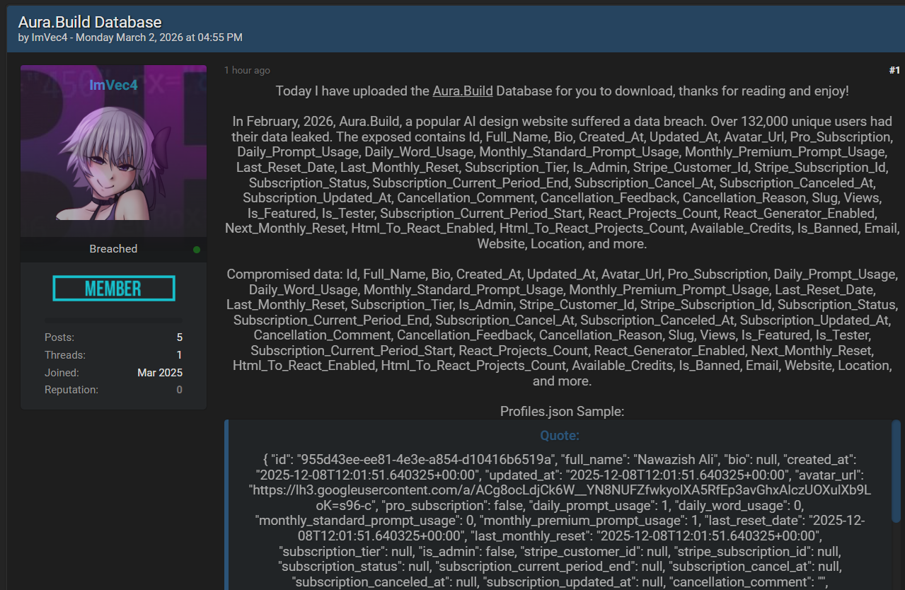 一名威胁行为者在黑客论坛上发布了 Aura.Build 的完整数据库泄露,声称于2026年2月入侵并窃取用户数据。该平台暴露超过132,000个唯一用户,包含详细的用户配置文件、订阅状态、使用统计和创作元数据。
