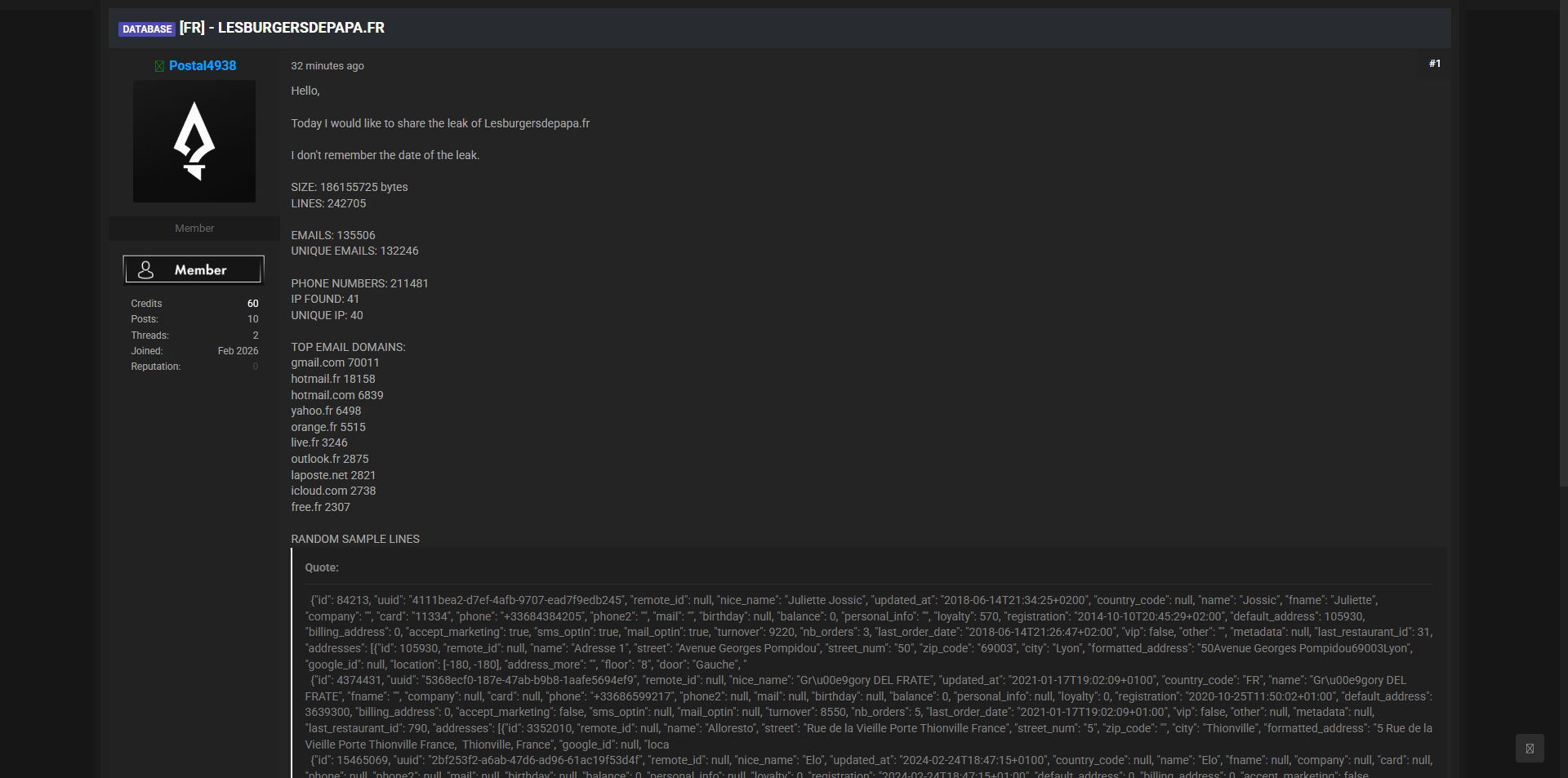 黑客论坛上曝光了法国知名汉堡连锁店Lesburgersdepapa.fr的客户数据库,包含24.27万条记录、13.55万电子邮件地址(其中13.22万唯一邮箱)和21.15万电话号码,同时涉及大量客户姓名、详细地址、订单记录等敏感信息。