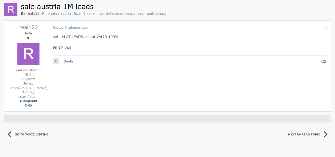 黑客论坛出售奥地利100万条高质量AT Leads数据库,数据来自多个来源且宣称有效率100%,包含大量姓名、联系方式等个人信息。