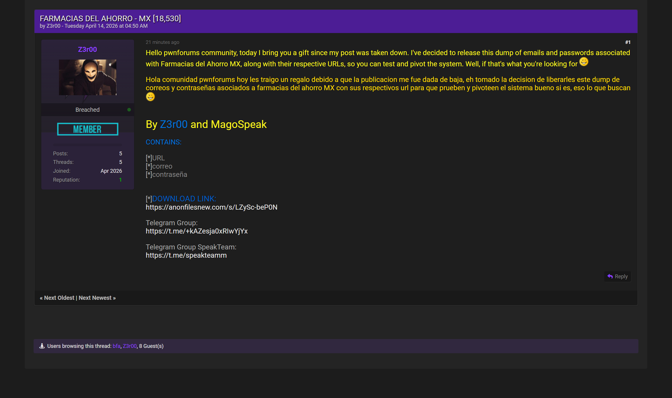 黑客论坛曝光墨西哥知名药房连锁Farmacias del Ahorro完整用户数据库转储,共18,530条记录,每条均包含对应URL、邮箱地址及明文密码。