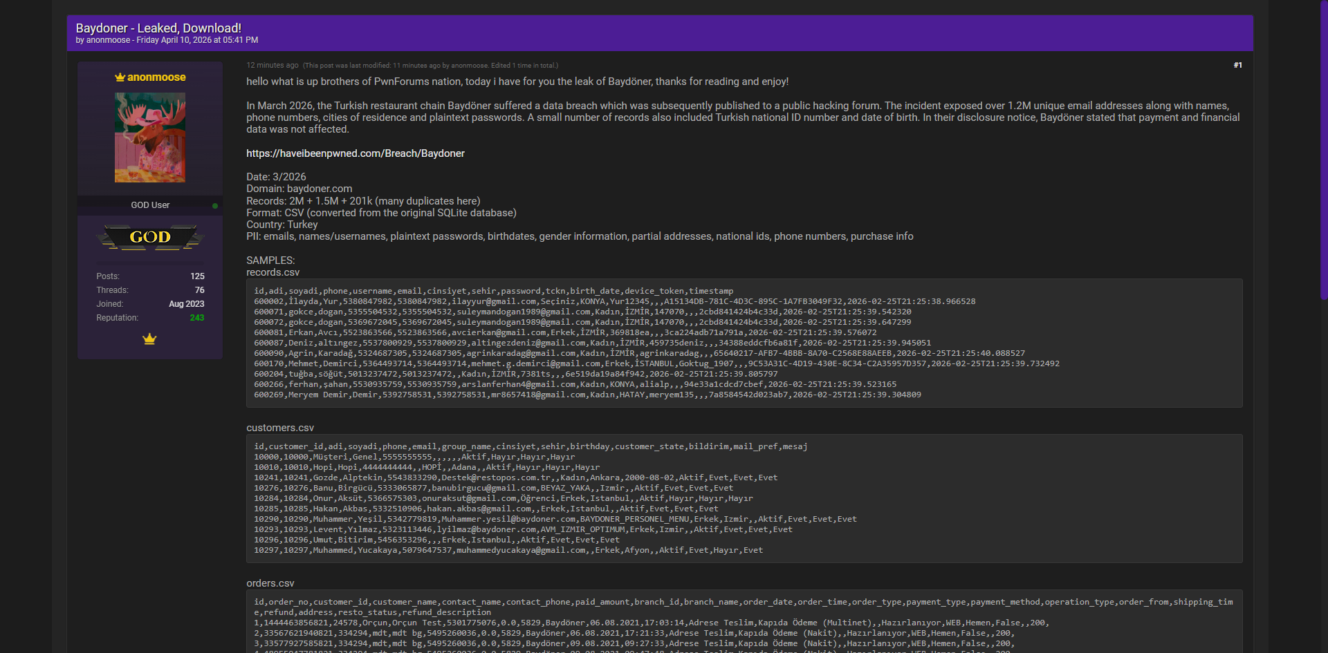 黑客论坛曝光土耳其知名餐厅连锁Baydoner完整数据库,泄露超过120万独特邮箱地址,以及姓名、电话号码、居住城市、明文密码等大量个人信息,部分记录还包含土耳其国民身份证号和出生日期。