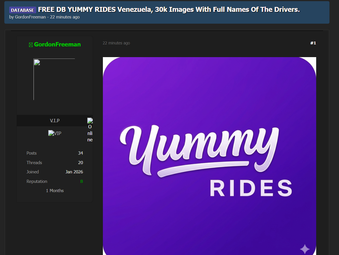威胁行为者在黑客论坛上发布了针对Yummy Rides数据的泄露声明,包括数据库描述和30k图像说明,声称已获取并免费公开司机照片与全名。该威胁行为者 GordonFreeman 主要从事拉美企业数据泄露。该实体是Yummy Rides,属于委内瑞拉,一家网约车/外卖配送平台,专注于提供乘车、送餐服务,用于司机管理和客户匹配。