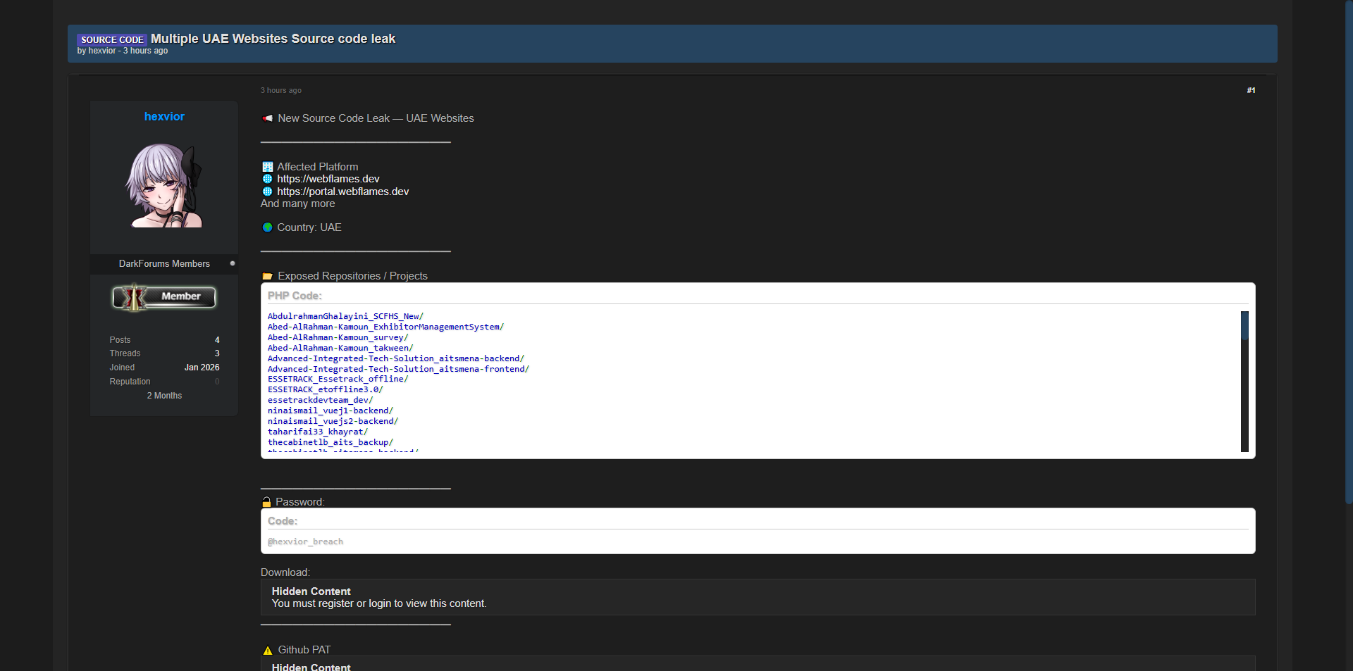 威胁行为者hexvior在黑客论坛上发布了阿联酋多个网站的完整源代码泄露包。该泄露主要涉及webflames.dev及portal.webflames.dev等平台,包含大量PHP项目仓库及前后端代码。