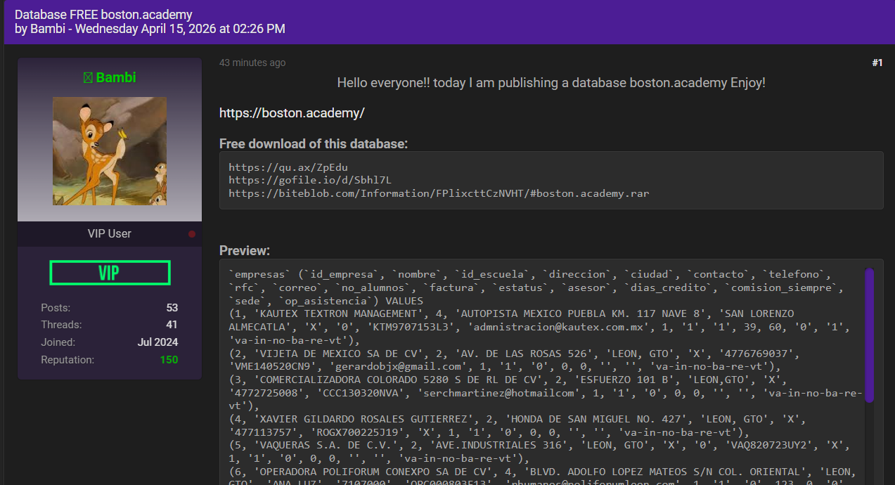 零零信安暗网新闻 | 墨西哥Boston Academy教育机构企业数据库泄露