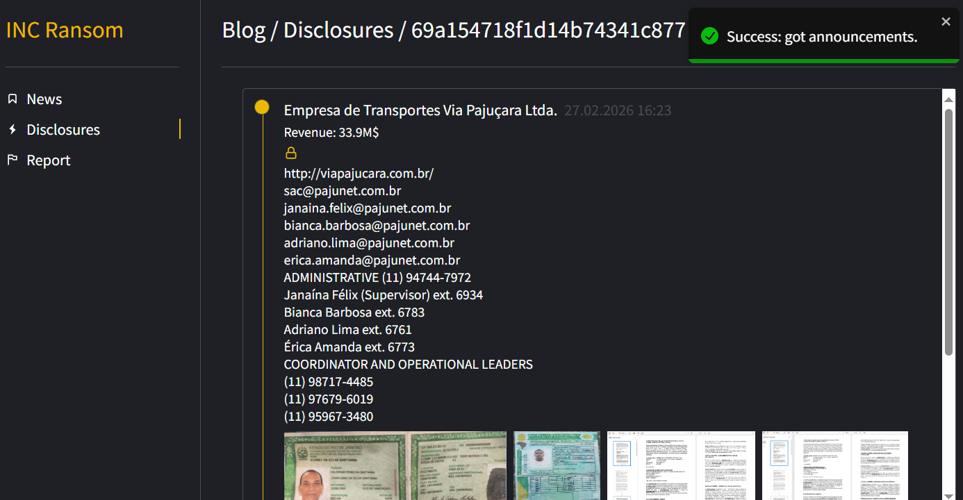 巴西运输物流公司 Empresa de Transportes Via Pajuçara Ltda. 遭 INC Ransom 勒索攻击,内部联系人与运营数据曝光!
