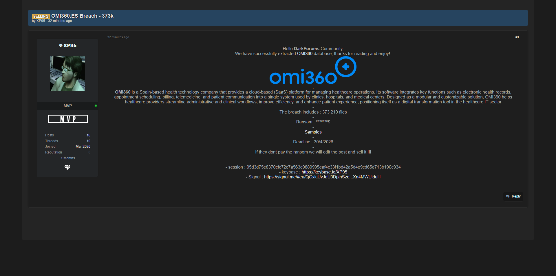 零零信安暗网新闻 | 黑客论坛曝光西班牙OMI360医疗SaaS平台37.3万条健康数据