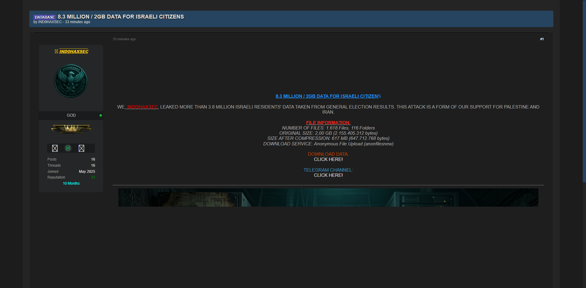 该数据涉及超过380万以色列居民的信息,来源于选举结果。威胁行为者在黑客论坛上公开了这些数据,作为对巴勒斯坦和伊朗的支持。