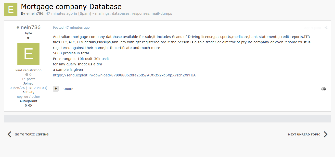 零零信安暗网新闻 | 黑客论坛出售澳大利亚抵押贷款公司5000份客户数据库