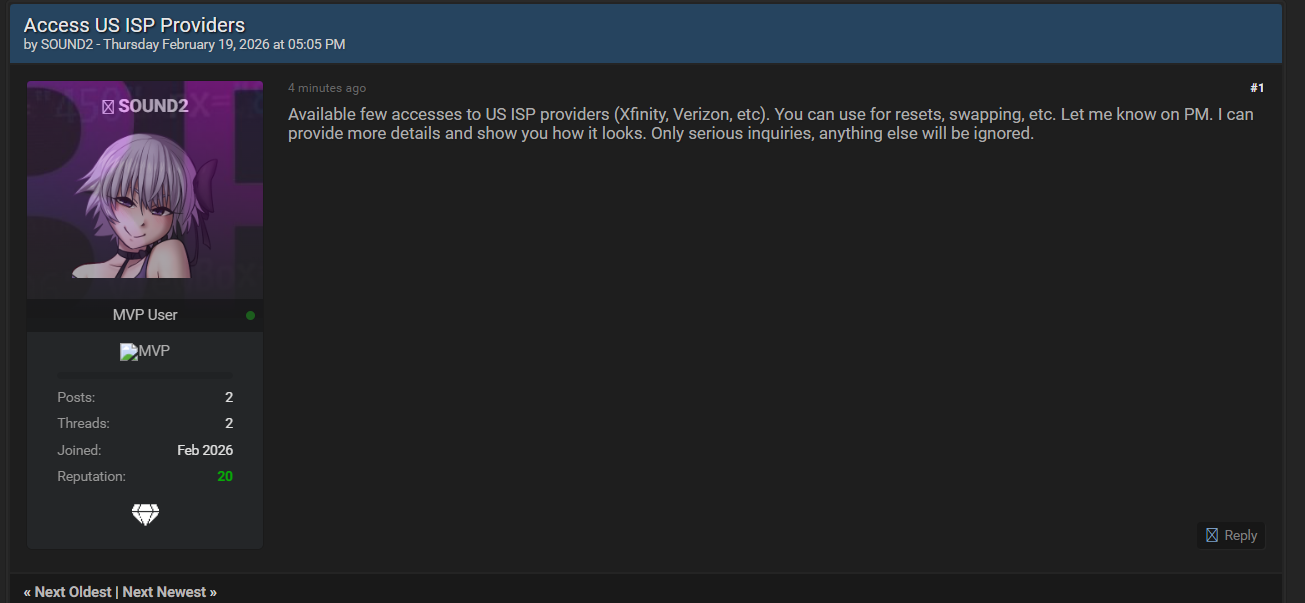 威胁行为者在暗网与黑客论坛公开宣称,出售对多家美国本土互联网服务提供商(ISP)的未授权访问权限,可直接登录运营商内部系统、后台管理面板、客户支撑平台或网络运维接口。此类权限属于高价值初始访问入口,常被用于后续数据窃取、流量劫持、客户信息泄露、供应链渗透或二次转卖。目前暂未披露具体涉事 ISP 名单、权限类型与售价,相关渠道仅支持加密货币交易,风险处于扩散中。