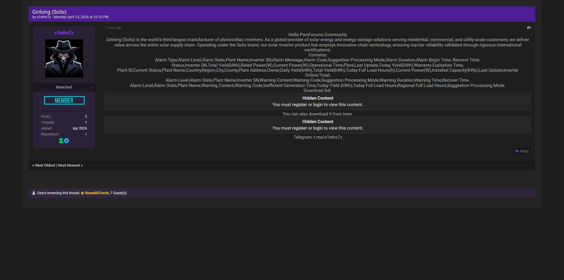 黑客论坛曝光全球第三大光伏逆变器制造商Ginlong(Solis)公司大量太阳能电站监控数据库。该公司为住宅、商业及公用事业规模客户提供太阳能逆变器与储能解决方案,此次泄露包含众多真实电站的实时运行与告警数据。