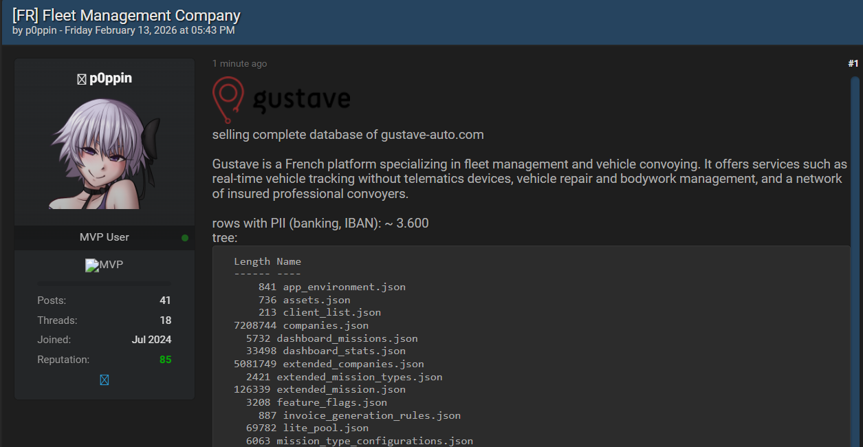 法国车队管理与护送平台 Gustave 已遭数据泄露,其数据库在暗网论坛以 1,500 美元 挂牌出售,涉及约 3,600 条个人与企业敏感记录。