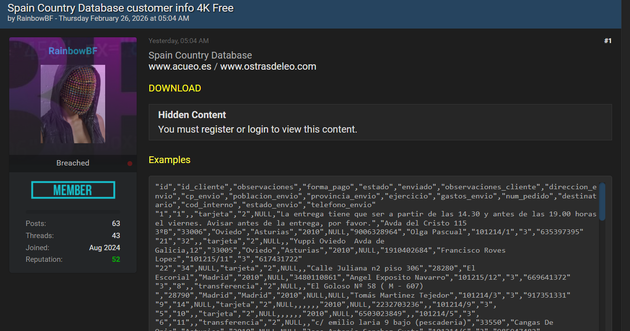 威胁行为者售卖了一份来自西班牙的客户数据库,规模约4000条记录。该数据疑似源于本地物流、交付或小型电商平台的订单系统,包含西班牙多个地区的客户订单相关信息。
