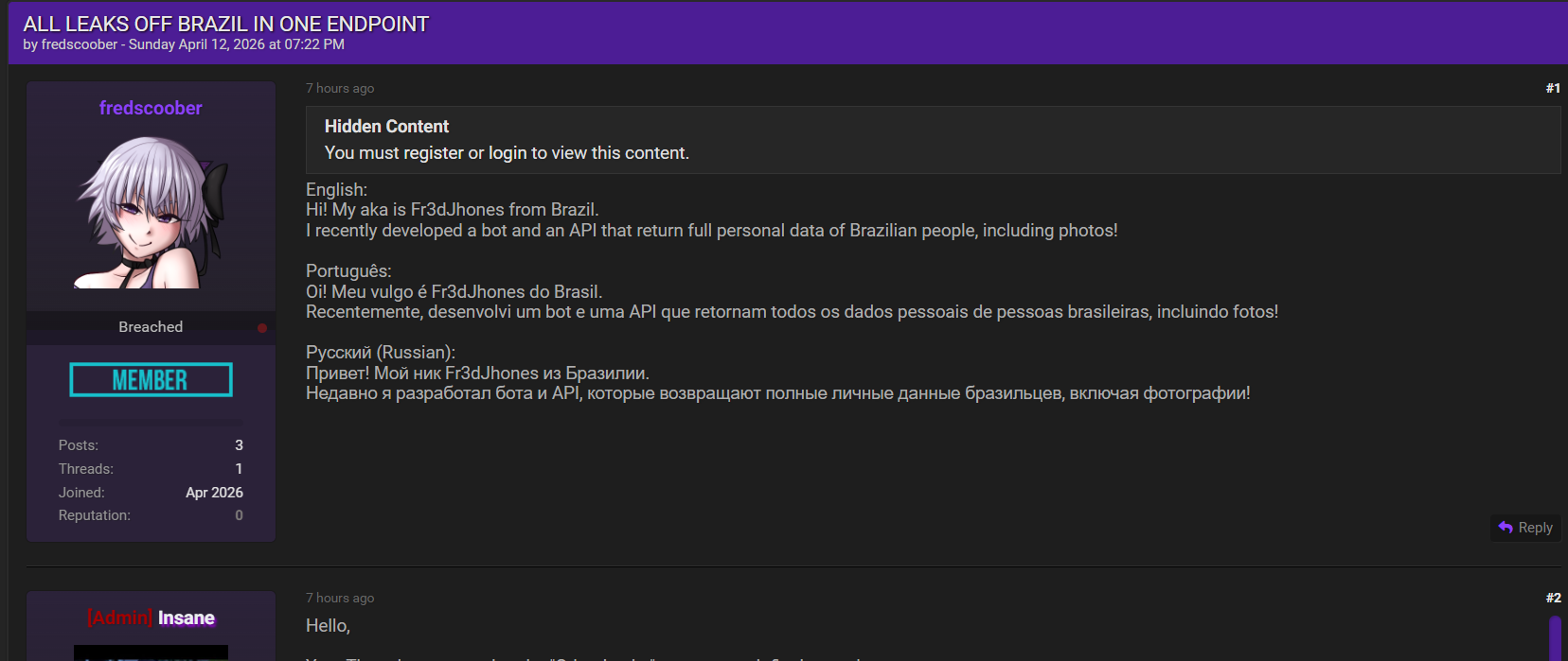 黑客论坛用户fredscoober发布“ALL LEAKS OFF BRAZIL IN ONE ENDPOINT”工具,宣称开发了bot和API,能从单个端点返回巴西公民完整个人信息,包括姓名、照片、地址、联系方式、身份证号等多项敏感数据,聚合了巴西各类泄露来源。