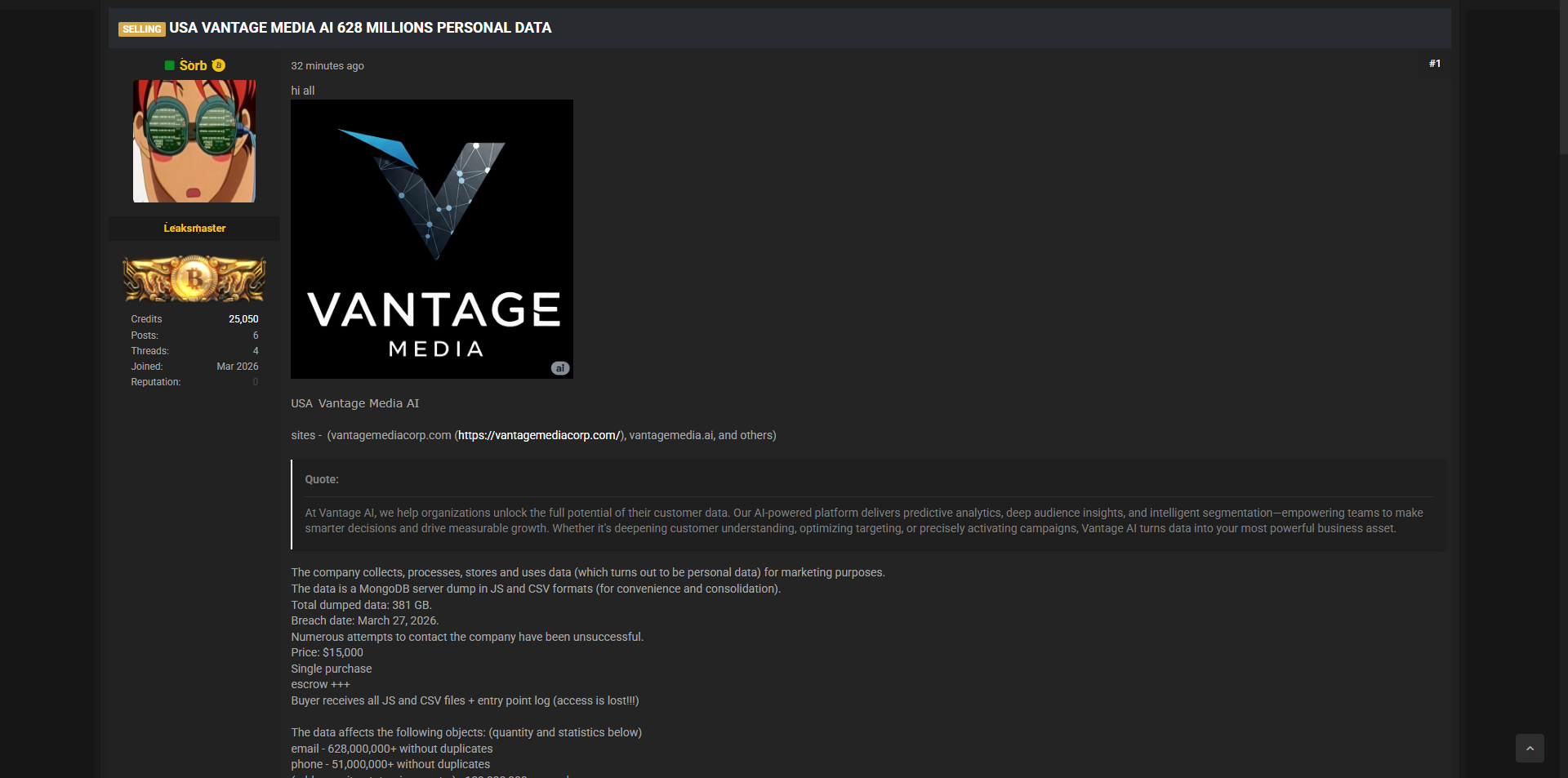 黑客论坛上出售美国Vantage Media AI(一家AI驱动的营销数据分析平台)的海量用户数据库,包含628,000,000+条电子邮件地址(无重复)和51,000,000+条电话号码(无重复),数据来自MongoDB服务器完整转储,总大小381GB。
