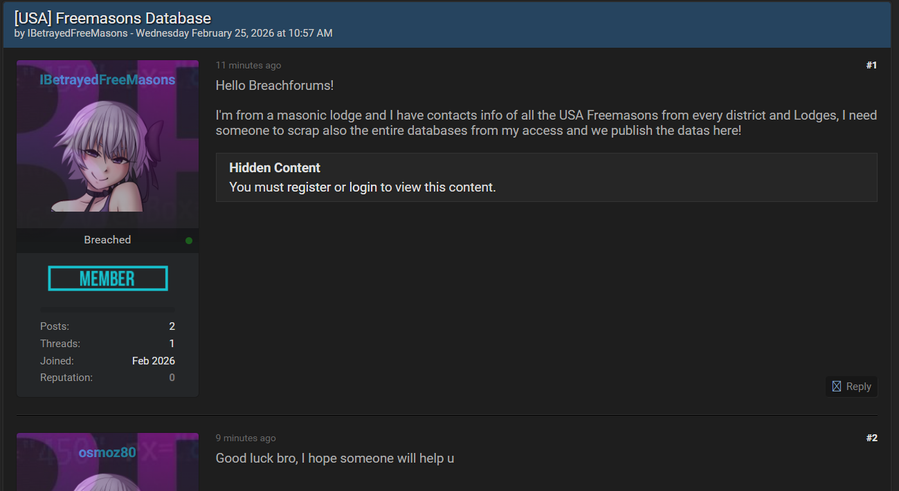 2026年2月25日,黑客论坛上一个威胁行为者发布帖子,自称来自美国某共济会分会(Masonic lodge),声称掌握全美 Freemasons 的联系信息,覆盖所有地区(districts)和分会(lodges)。