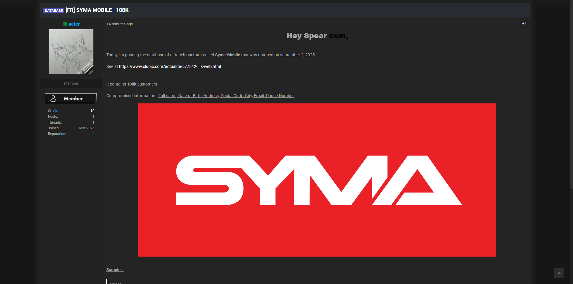 零零信安暗网新闻 | 威胁行为者黑客论坛曝光法国Syma Mobile 10.8万用户数据