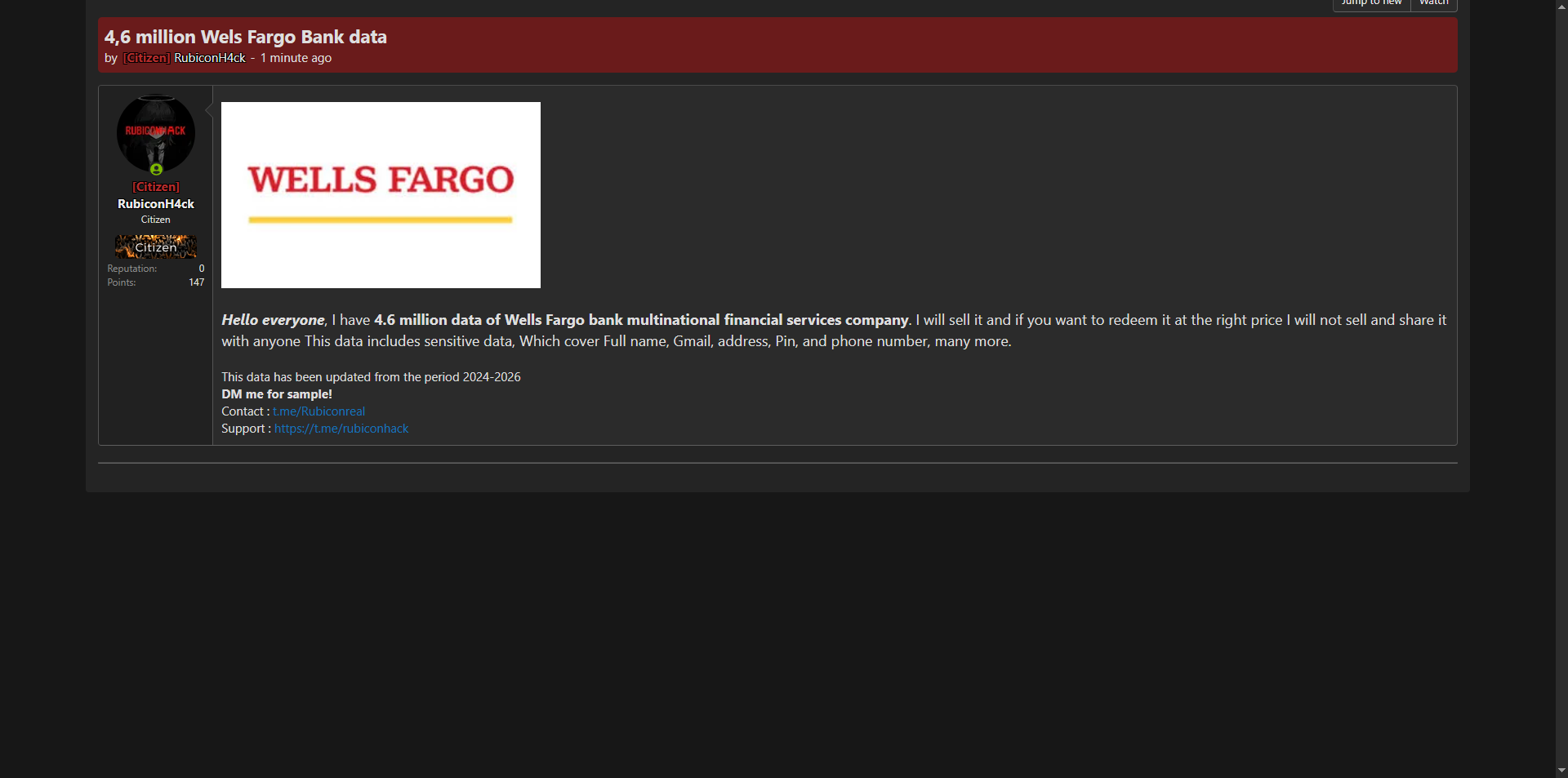 黑客论坛曝光美国富国银行460万条客户数据,泄露了完整姓名、Gmail邮箱、家庭地址、PIN码、电话号码等高度敏感个人信息,数据覆盖2024-2026年,已公开出售。