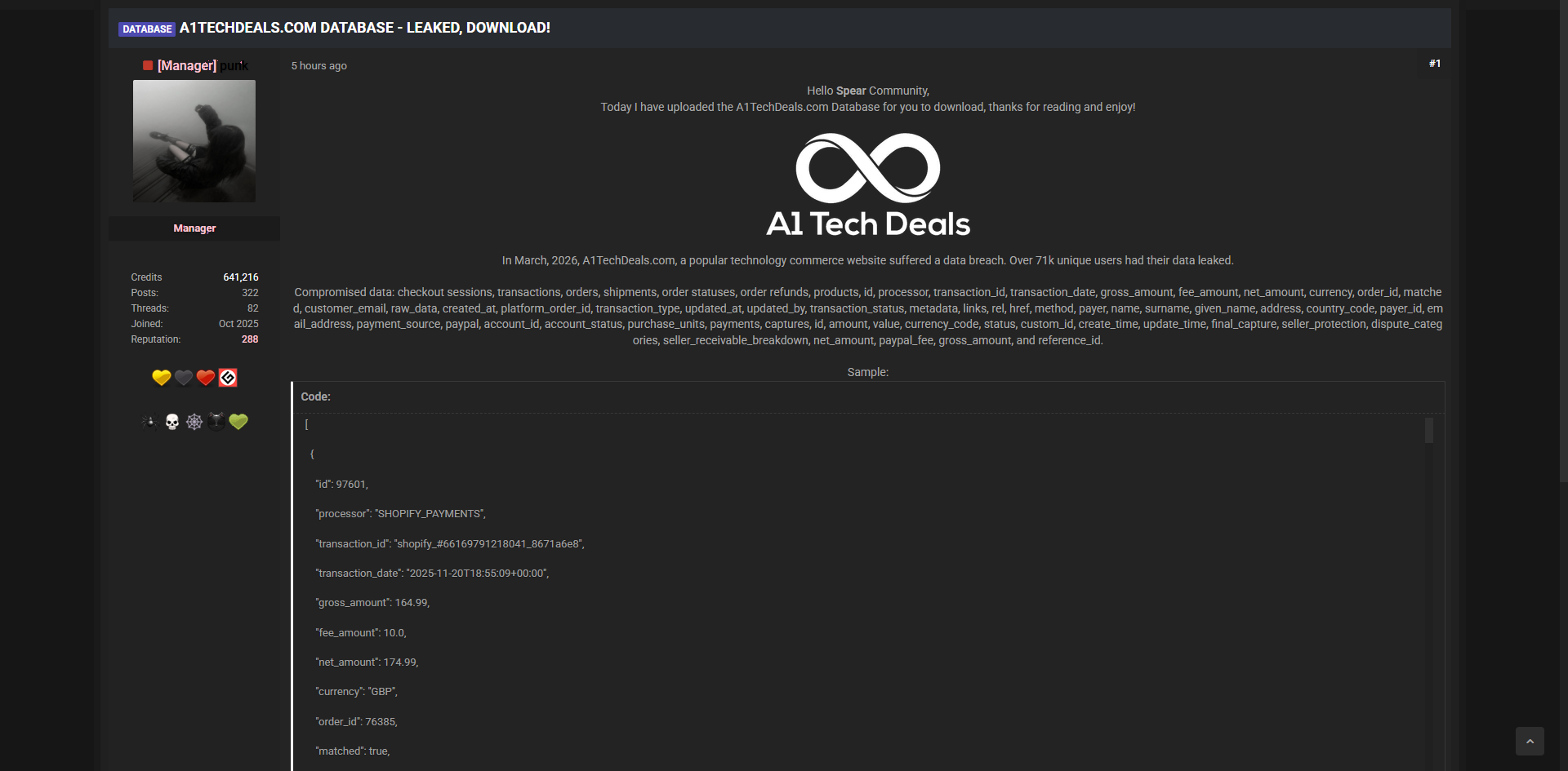 黑客论坛曝光A1TechDeals.com科技电商平台的完整数据库,超过7.1万用户交易记录、订单详情、支付信息及客户资料遭到泄露。