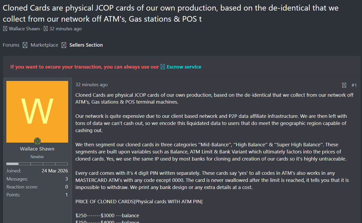 威胁行为者在黑客论坛宣称,其团队通过ATM机、加油站及POS终端机组成的庞大客户端网络和P2P数据联盟,持续收集大量真实刷卡数据,并生产物理JCOP克隆信用卡出售。这些卡片使用银行常用IP进行克隆,极难追踪。卖家将卡片分为“中余额”、“高余额”和“超级高余额”三个等级,并为每张卡单独提供4位ATM PIN码,支持全球绝大多数Mastercard ATM机使用。
