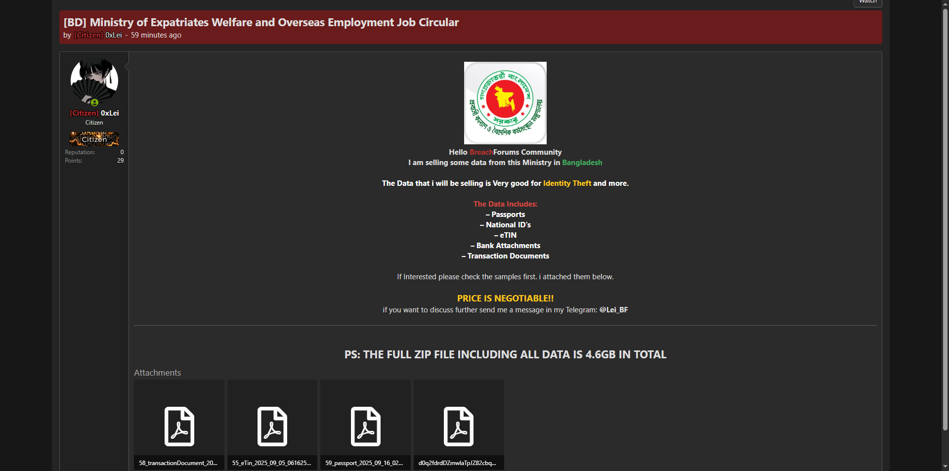 黑客论坛出售孟加拉国侨民福利与海外就业部(Ministry of Expatriates Welfare and Overseas Employment)大量内部数据,总容量4.6GB ZIP文件,包含护照、国民身份证、eTIN电子税务识别号、银行附件及交易文件等高度敏感的官方文档和个人信息。
