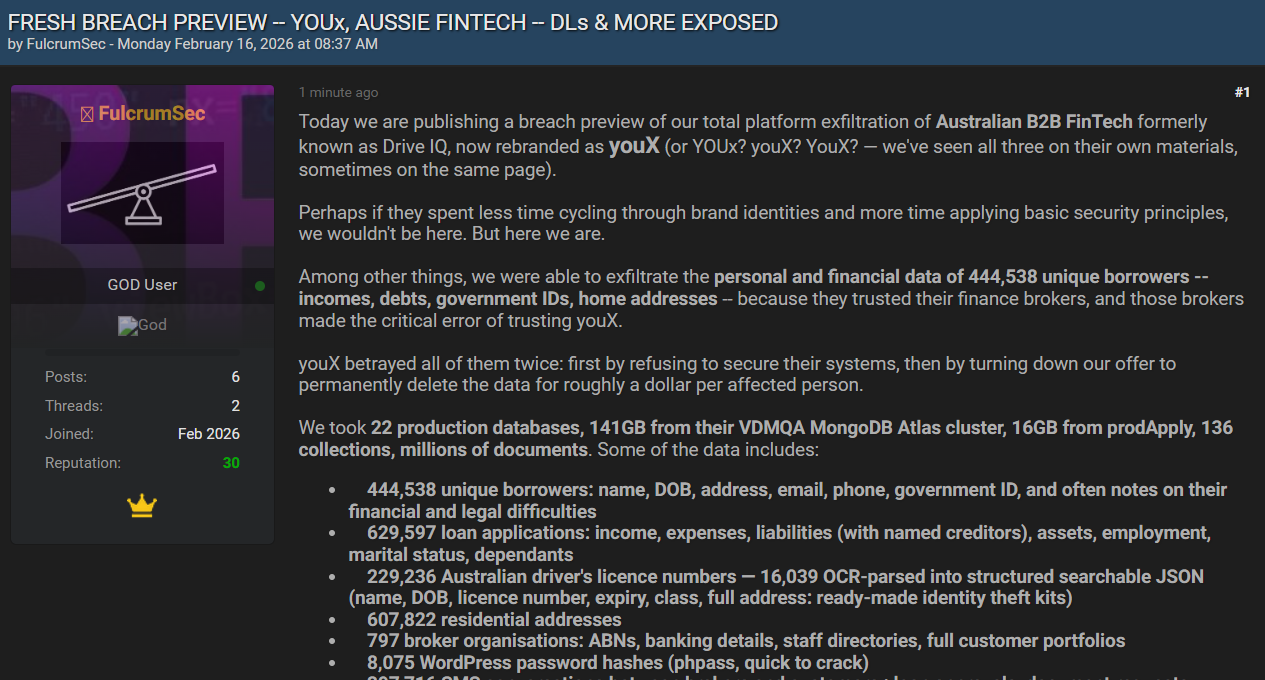 相关勒索组织声称入侵了澳大利亚B2B金融科技公司youX(前身为Drive IQ,其官方资料中出现过YOUx、youX、YouX三种写法)。youX是一家专注于B2B领域的金融科技企业,主要为金融经纪人与贷款机构提供服务,助力贷款申请流程的推进,同时负责管理相关借款人及合作机构的各类核心数据。