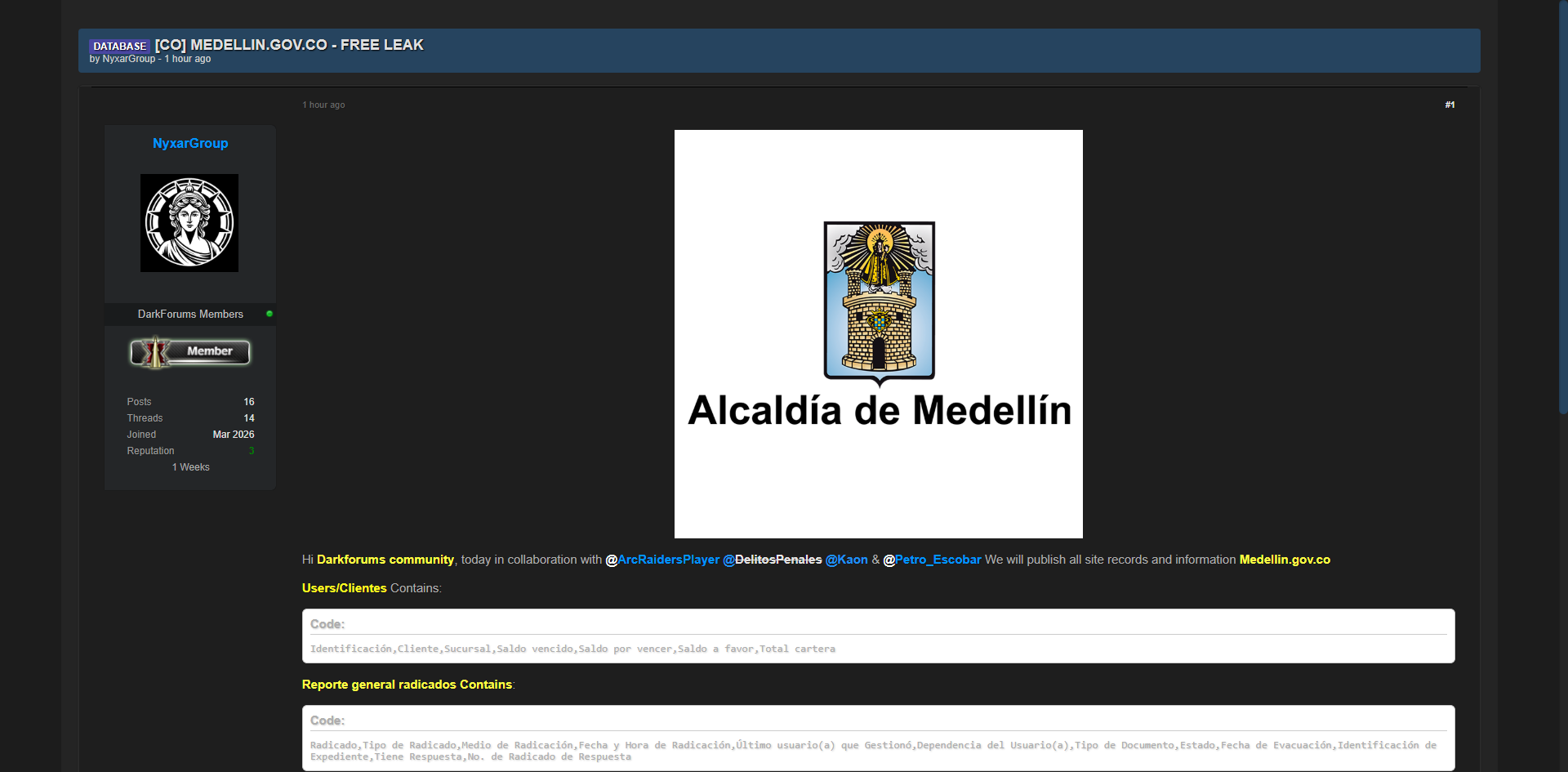 零零信安暗网新闻 | 威胁行为者黑客论坛曝光哥伦比亚麦德林市政府数据