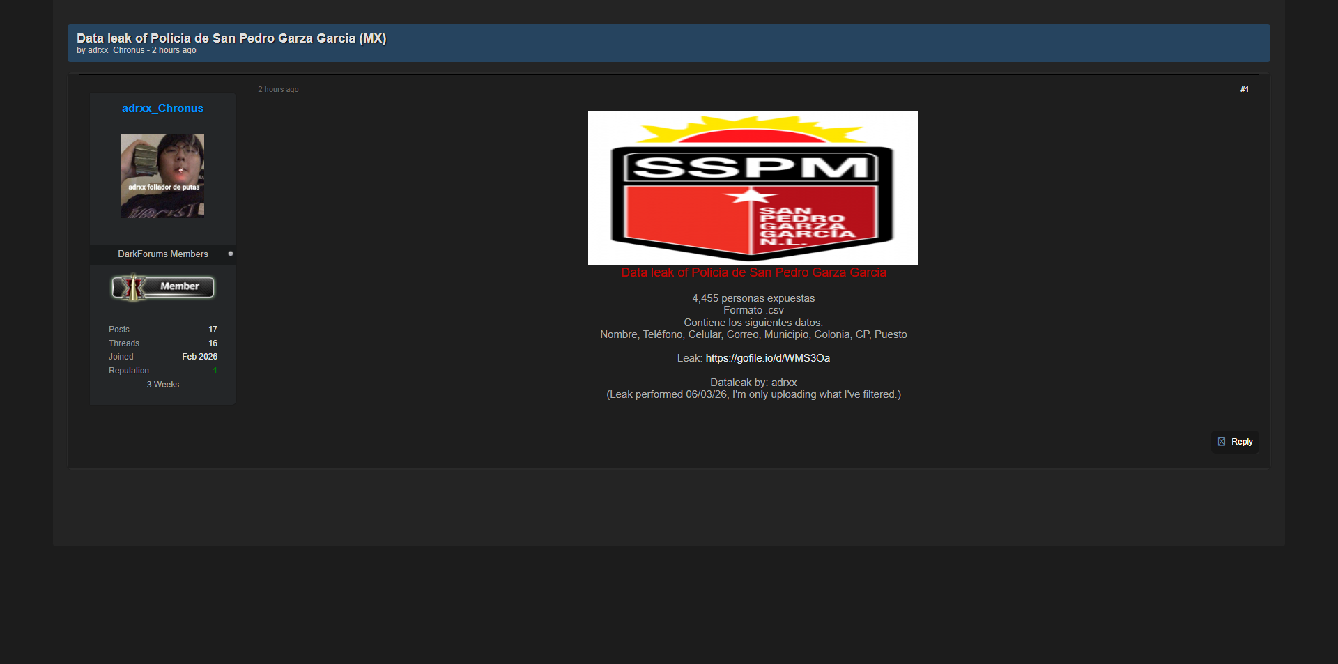 威胁行为者在黑客论坛上曝光了墨西哥圣佩德罗加尔萨加西亚市警察局(SSPM)的内部人员数据,包含4,455条警员及相关人员记录。该数据为CSV格式,主要涉及警务人员的姓名、联系方式、地址及职位等敏感信息。