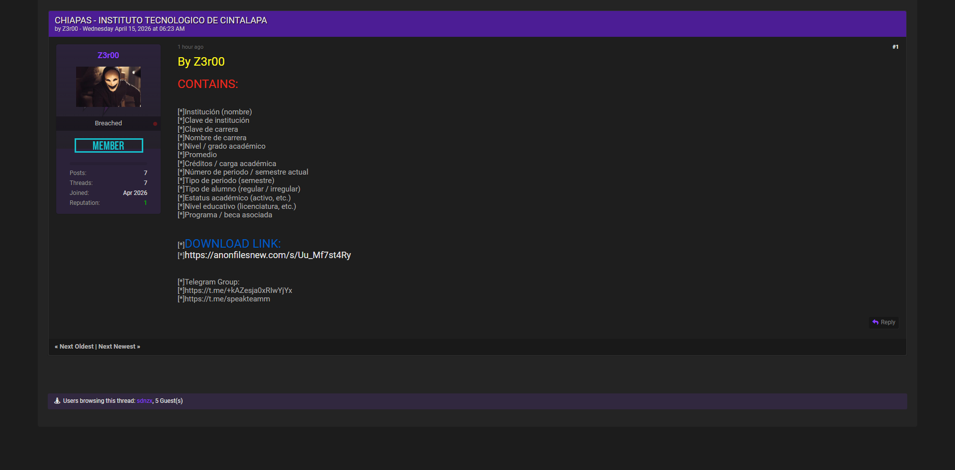 零零信安暗网新闻 | 墨西哥奇亚帕斯州Cintalapa技术学院学生数据库泄露