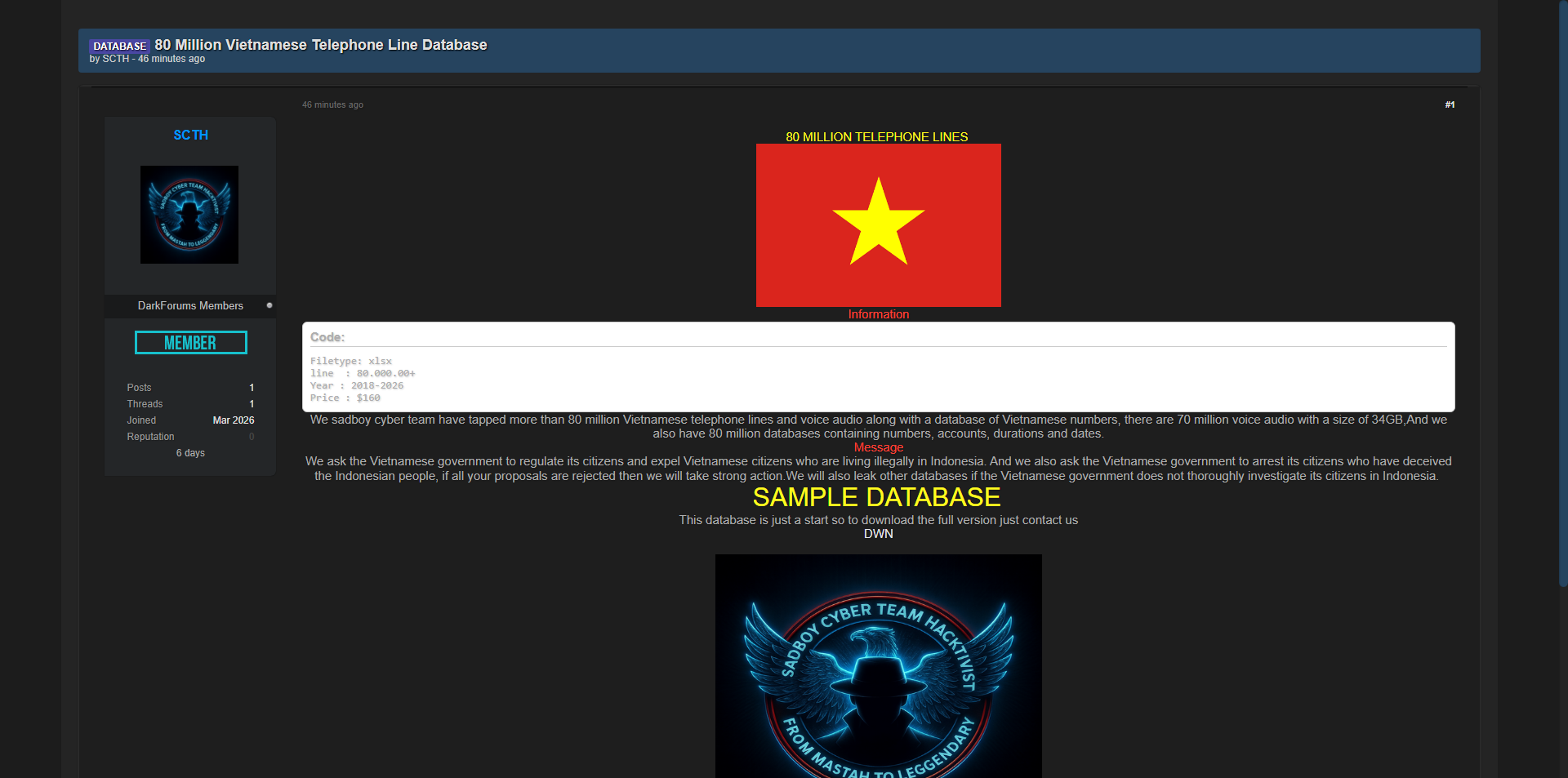 黑客论坛上曝光越南8000万电话线路数据库,包含大量电话号码、用户账户信息、通话时长、通话日期以及7000万条语音音频文件(共34GB),时间跨度2018-2026年。