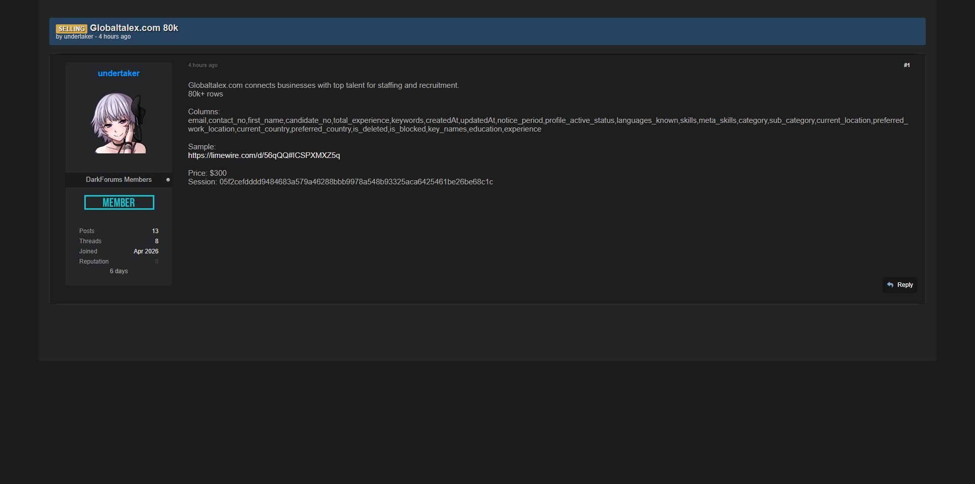 零零信安暗网新闻 | Globaltalex.com国际招聘平台8万人才数据泄露