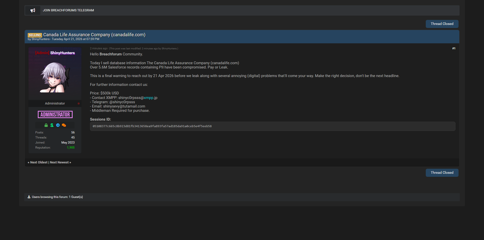 黑客组织ShinyHunters在暗网论坛出售加拿大知名保险公司Canada Life Assurance Company(canadalife.com)完整Salesforce数据库,超过560万条记录,包含大量个人身份信息(PII)及内部企业数据。