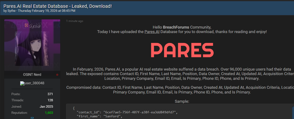 Pares.AI 房地产 AI 平台已被确认发生重大数据泄露事件。截至目前,官方尚未披露具体泄露时间、技术成因及完整数据规模;威胁情报显示,此次泄露极可能涉及平台核心的房产交易数据、用户个人身份信息(PII)及 AI 训练相关的敏感业务数据,对平台用户隐私、交易安全及企业经营构成严重威胁,已引发房地产科技(PropTech)行业的广泛关注。