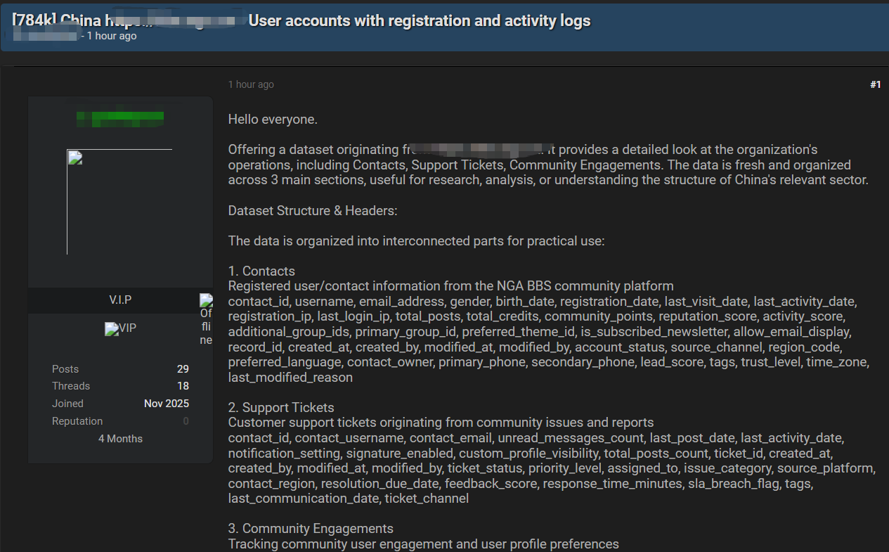 威胁行为者在黑客论坛宣称,已获取中国知名游戏社区平台*****的用户数据库。该数据集包含大量用户注册信息、登录活动记录、支持工单以及社区互动日志。卖家表示数据结构清晰且新鲜,共分为三个主要部分,用于研究或分析中国游戏社区的用户行为与平台运作。